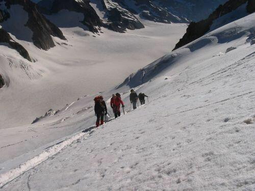 En route vers notre première descente, face au refuge de la Glère, sous le regard de Popol & co